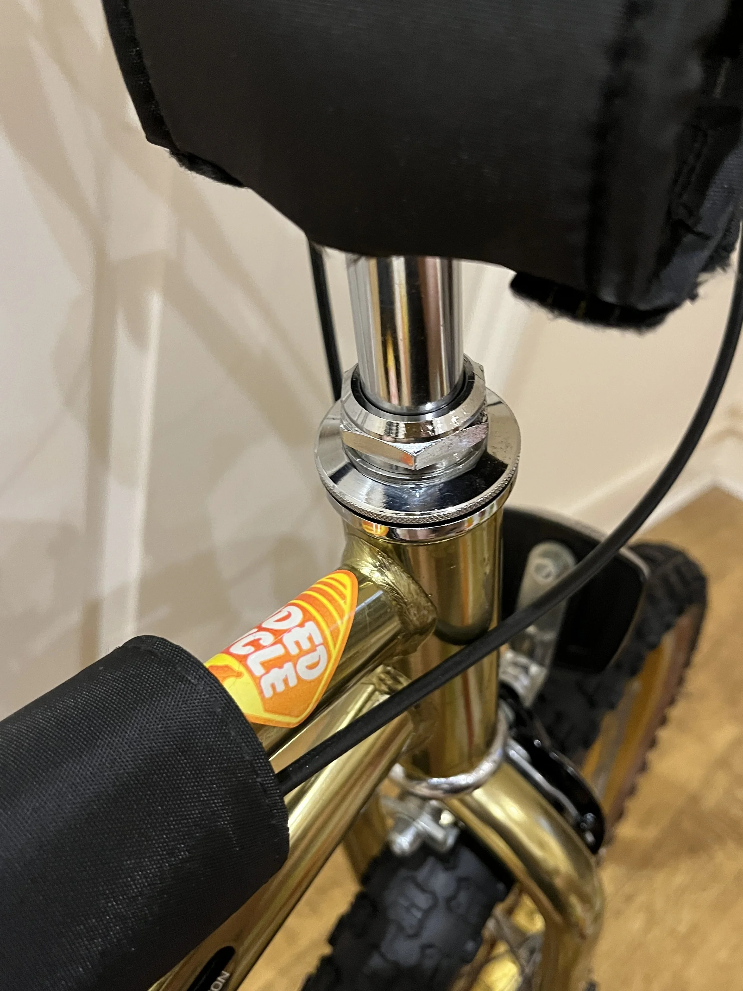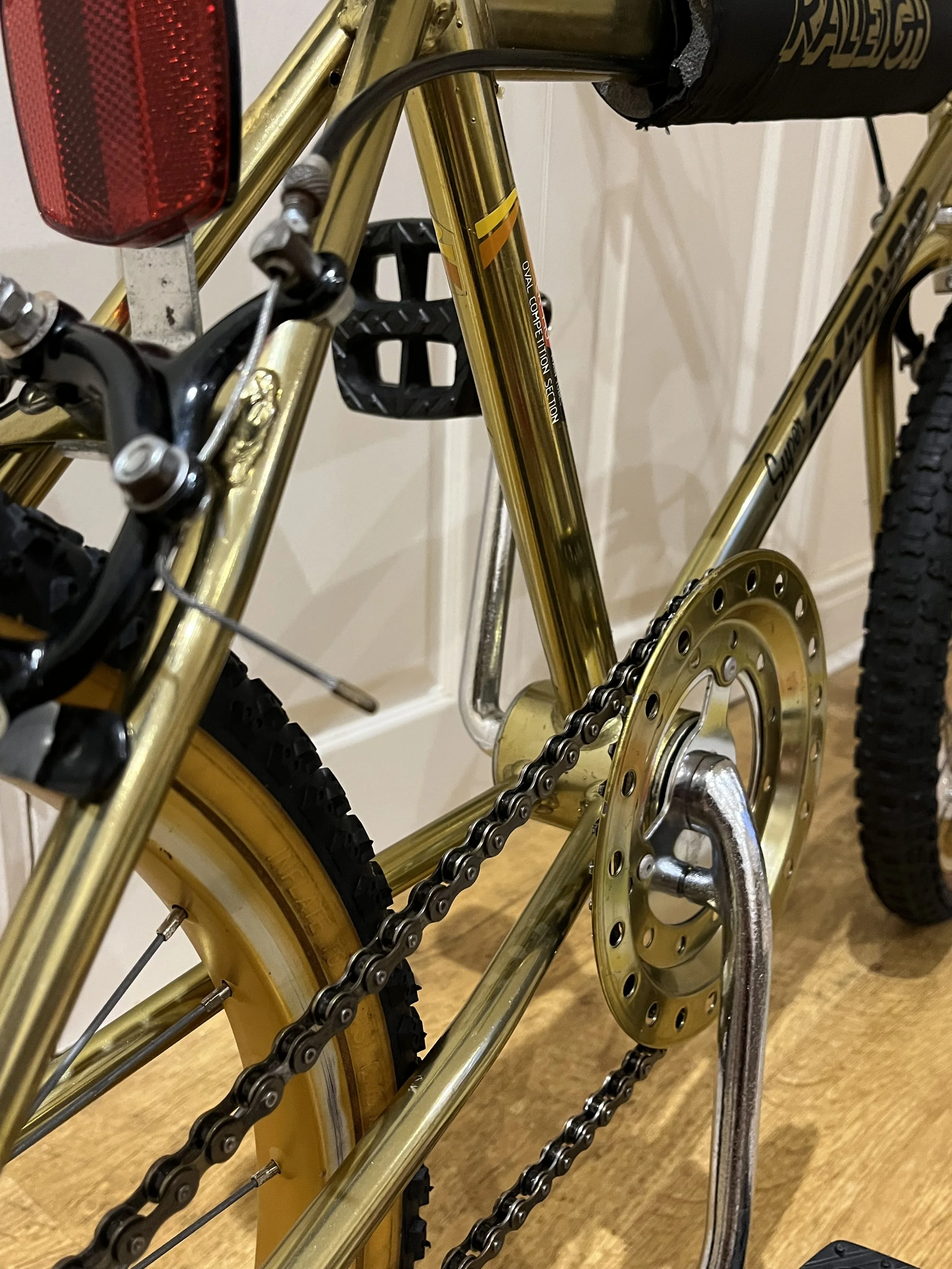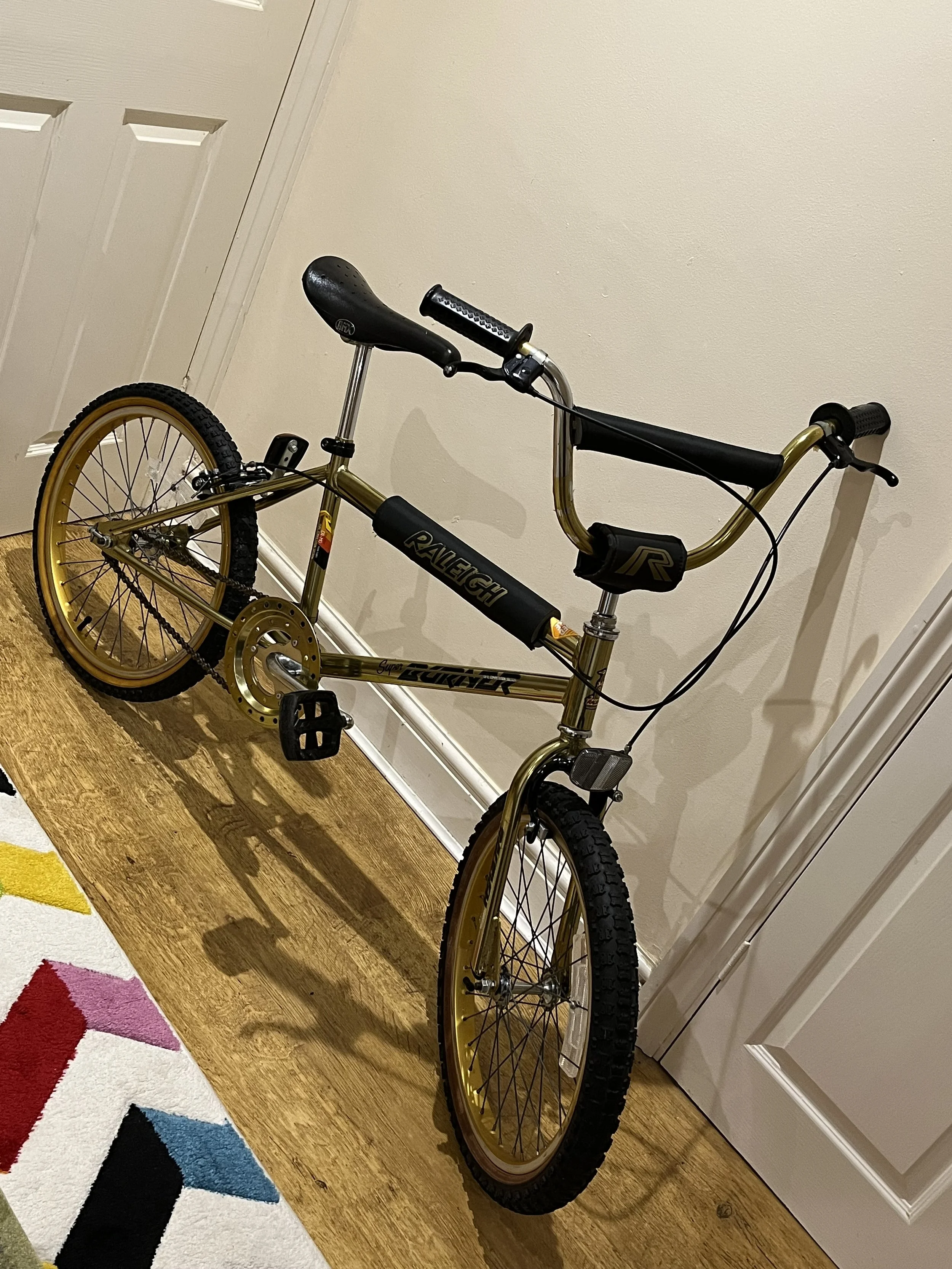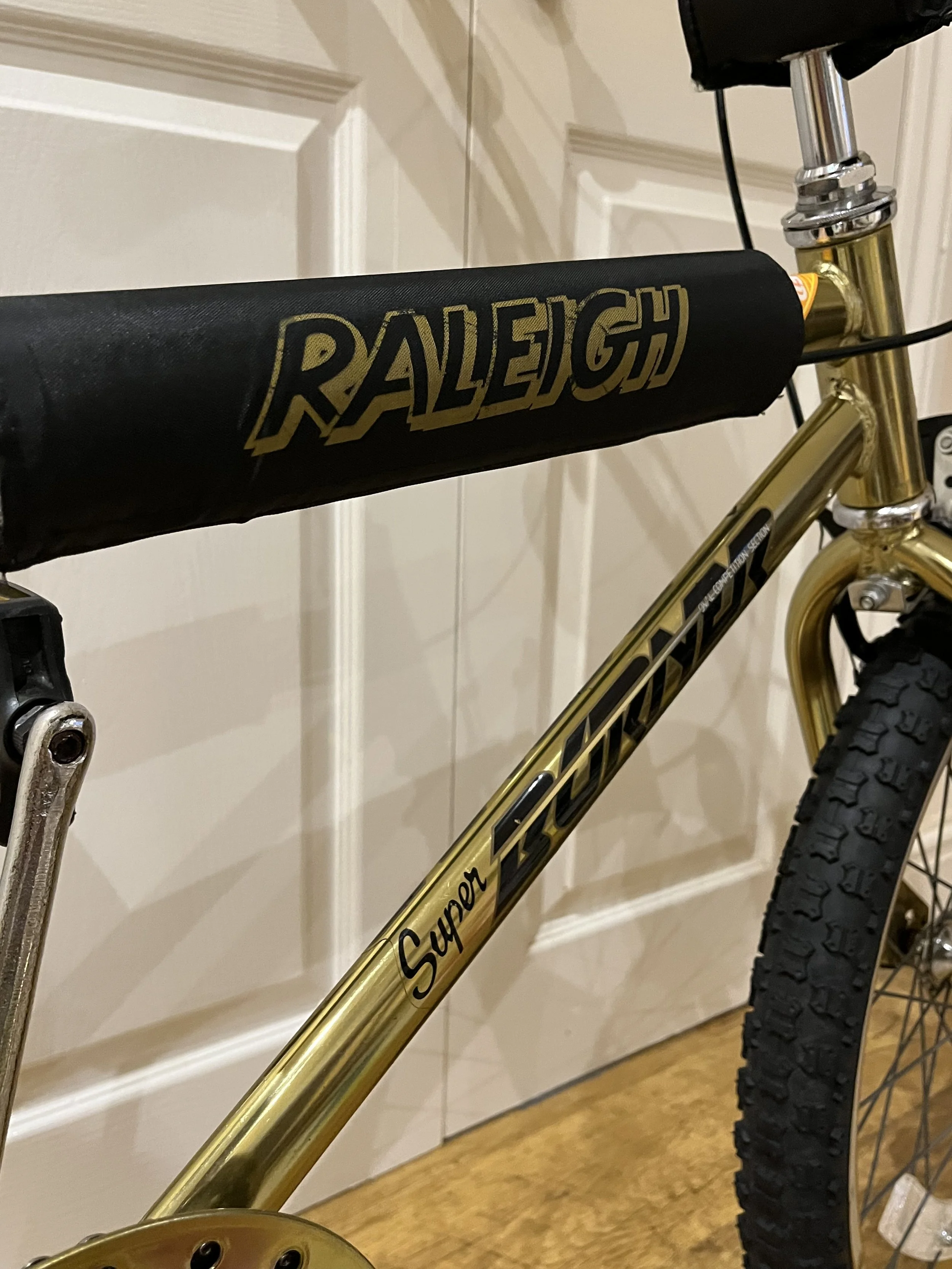 The Raleigh Super Burner Mk2 was first released in 1984. It blew the minds of kids back in the day with the extravagant super-chrome gold Carbospec frame, the black and gold pads and the ‘Super Burner decals’. The MK1 Super Burner was released in 1982 and featured many differences like black forks and many other different parts. The Superchrome gold frame on the MK1 was brighter and suffered a lot less from fading.